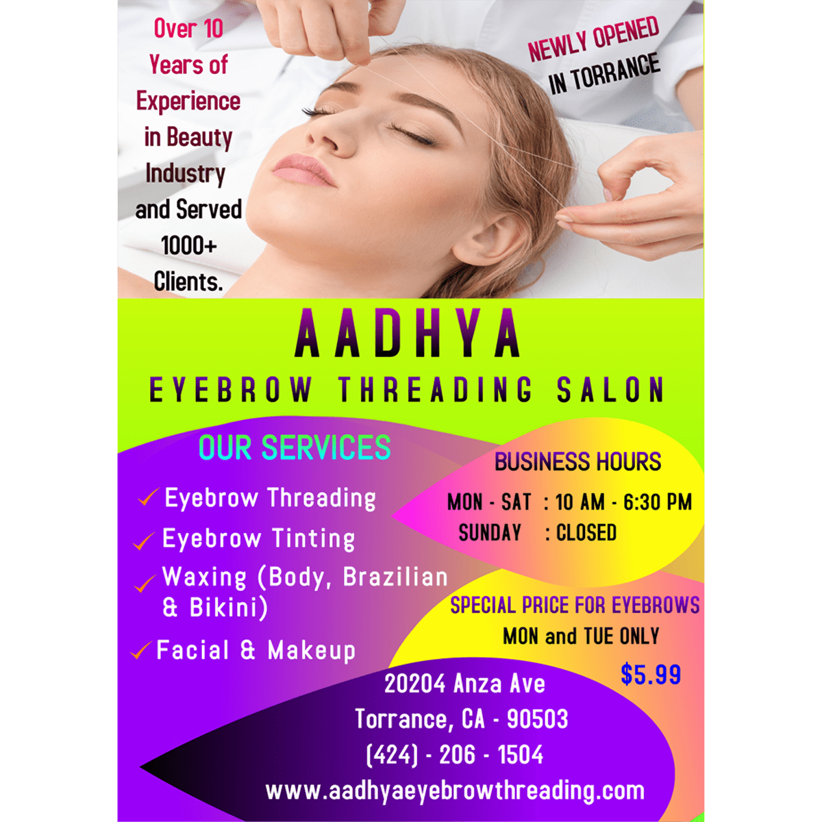 Aadhya Eyebrow Threading Salon is a beauty salon in Torrance, CA. We provide a safe and nurturing space to explore different options for improving your overall aesthetics. Our team will serve you with in-depth knowledge of the most relevant beauty techniques and practices so that you can look your best. Expect us to provide continued education and excellent client experience if you choose us at Aadhya Eyebrow Threading Salon. Additionally, we provide weekly specials for eyebrows. Due to Covid-19, we use a new technique for our threading and waxing services.